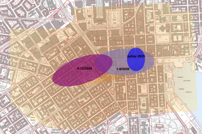 Syksyn 2024 aikana on tehty vesihuollon sekä alueen katujen saneerausten yhteinen rakentamisen vaiheistussuunnitelma. Työn yhtenä tavoitteena on minimoida tulevan rakentamisen haittoja liikenteelle ja kiinteistöjen saavutettavuudelle. Työssä laaditaan arviot rakentamisen eri vaiheiden kestosta ja pyritään ajoittamaan suurinta haittaa aiheuttavat työt tiiviiksi kokonaisuudeksi ja näin lyhentämään haittojen kestoa. Työn valmistuttua voidaan tarkemmin arvioida koko saneerauksen kesto ja mille vuosille mikäkin osuus ajoittuu.