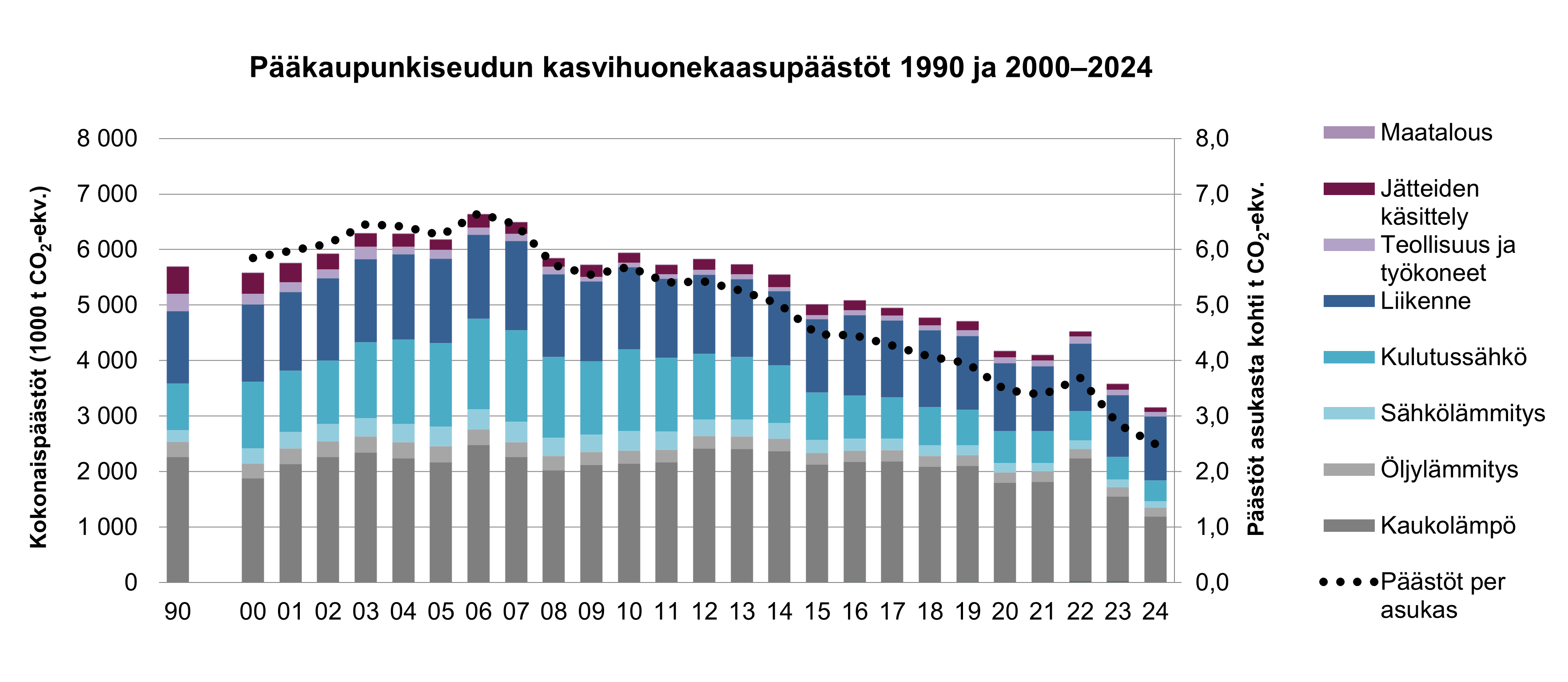 Kuva: Pääkaupunkiseudun kasvihuonekaasupäästöt 1990 ja 2000–2024.